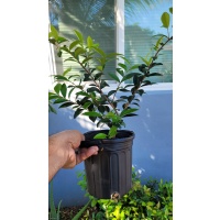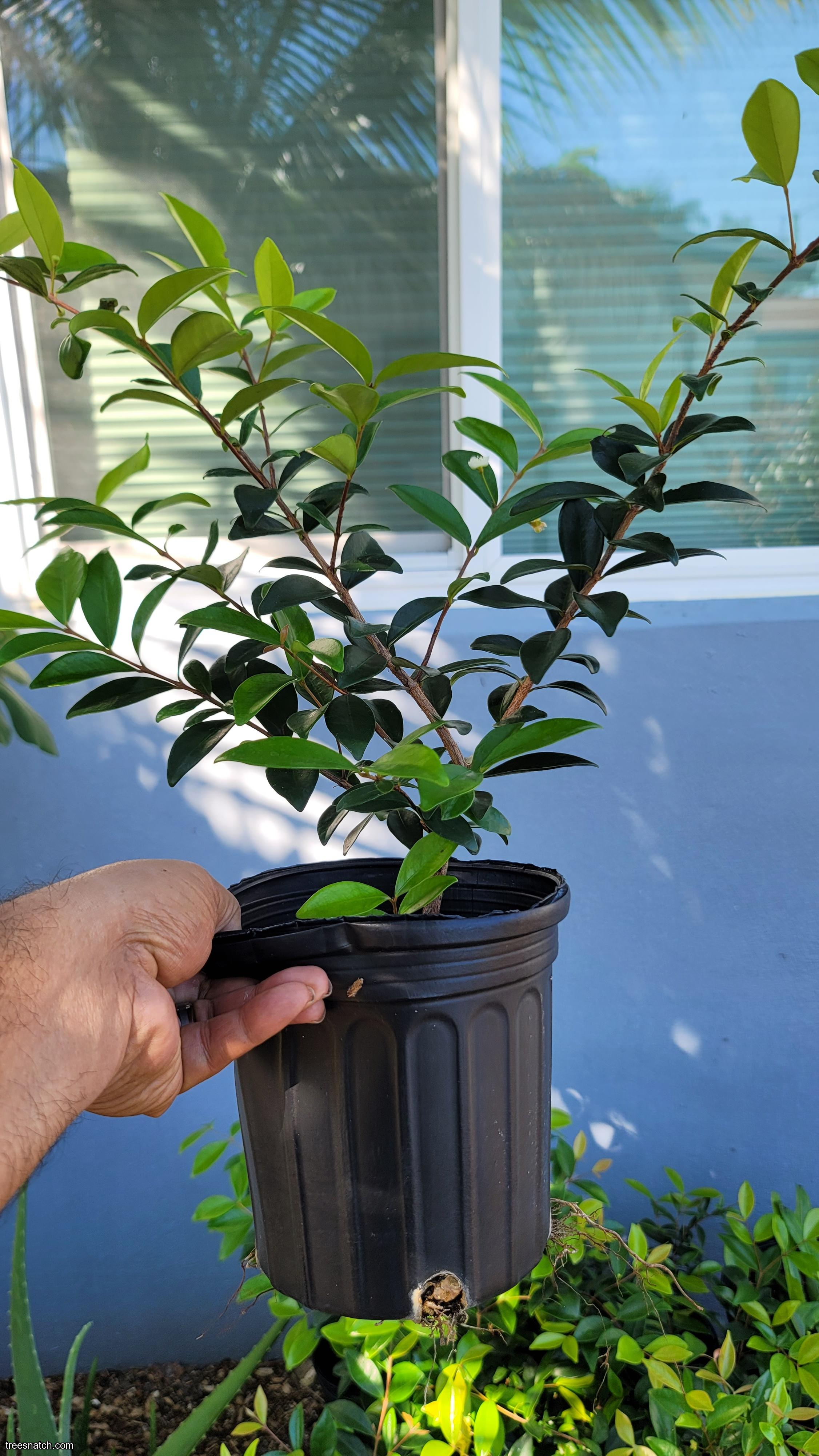 Healthy Cedar Bay Cherry in 1-gallon container. Sweet edible fruit, compact growth, and perfect for South Florida gardens or containers.